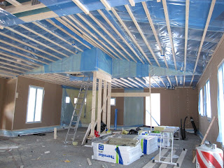 Maanantaina aloitettiin peltikaton asennus, valitettavasti viikolle osui pari tuulisempaa päivään jolloin miehet pitivät asennustaukoa. Timpurit ovat muovittaneet yläpohjan, aloittaneet koolauksien teon ja ilmastointimiehet ovat urakoineet putkien kanssa.